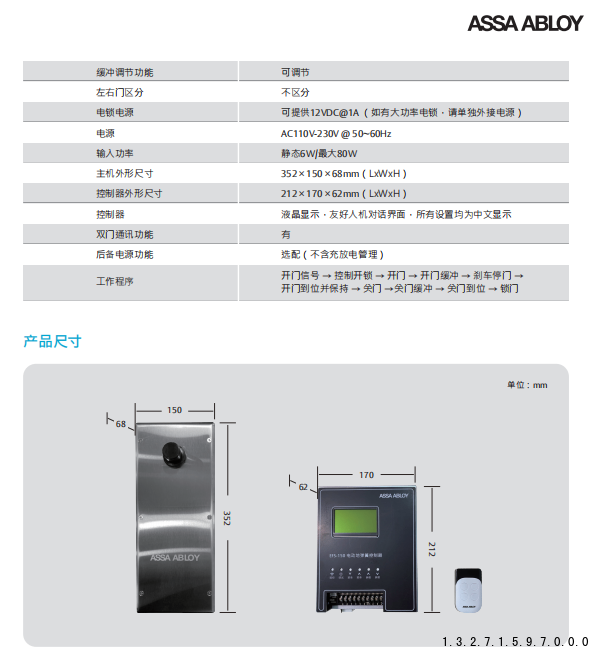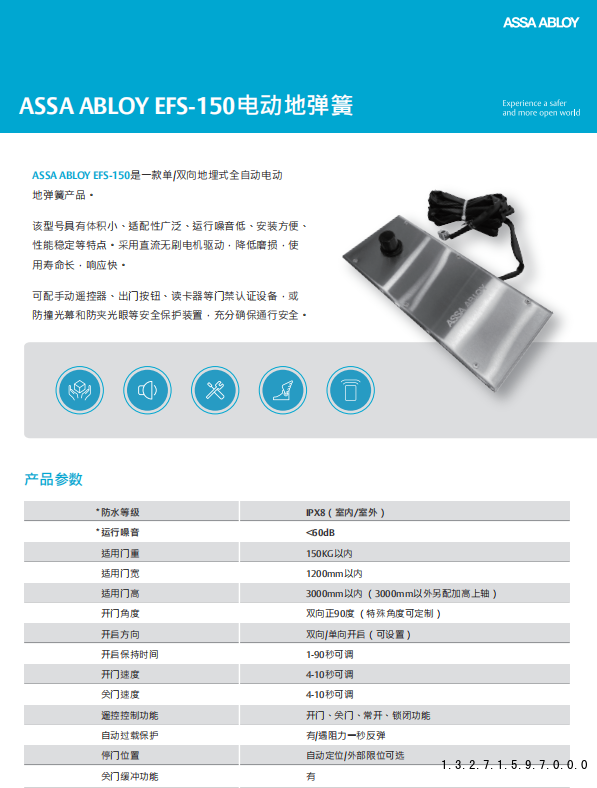 ASSA ABLOY EFS-150电动地弹簧产品参数*防水等级IPX8(室内/室外)*运行噪音<60db适用门重150kg以内适用门宽1200mm以内适用门高3000mm以内(3000mm以外另配加高上轴)开门角度双向正90度(特殊角度可定制)开自方向双向>