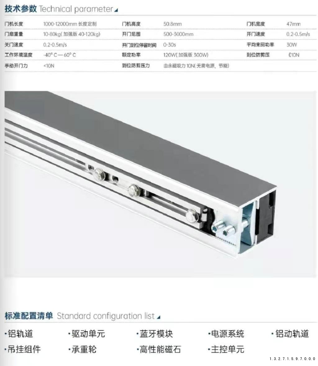 磁悬浮自动门技术指标Technical specifications of Maglev automatic door先进的技术采用智能控制系统,可随意设定开关门速度和开关门时间,调节方便运用新颖的电磁直线电机,结构更简单,可靠性更高具备良好的扩展性能,可与各种门禁系统相匹配涵有自适应系统、自动检测门的阻力、宽度,使门始终保持在最佳运行状态